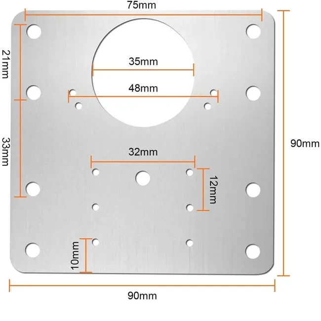 PIASTRA DI RIPARAZIONE NICHELATO per cerniere a scatto .Permette di riparare supporti in legno lacerati o mancanti per cerniere di ante di armadi e cucine. Materiale: Acciaio inossidabile. Dimensioni: La piastra misura 9 cm x 9 cm. Caratteristiche: Include un foro centrale da 35 mm per l'alloggiamento della cerniera e diversi fori per le viti di fissaggio.