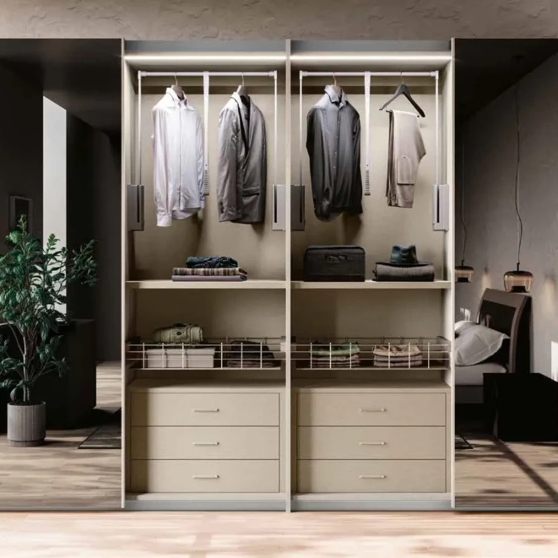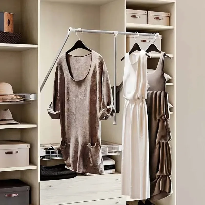 Servetto appendiabiti per armadio telescopico in acciaio verniciato grigio. Il servetto appendiabiti per armadio ti permette di avere accesso alla zone più alte dell'armadio senza sforzo. La barra è regolabile in larghezza per essere adattata al vano